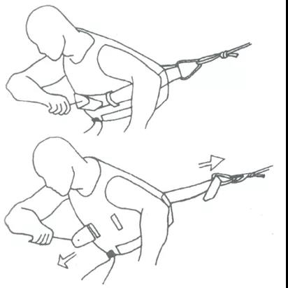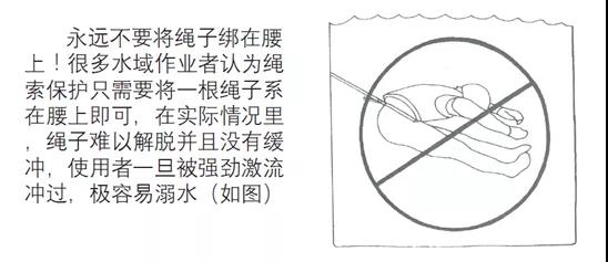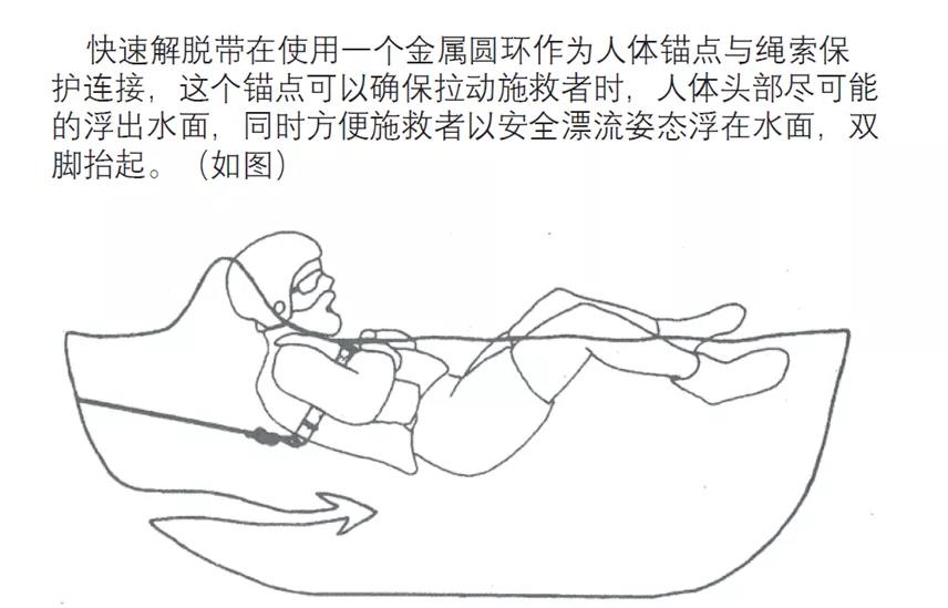 在危险水域作业时,一名施救者下水前一般都需要岸上另一名同伴进行绳索保护作业,但是水域作业不同于其他作业环境,变幻莫测的水流和水中的异物、树枝等很容易破坏绳索的拉力方向,以及造成缠绕。一旦出现这种情况,施救者在水中再去手动解除身后的牵引绳就非常危险,因此,快速解脱带带装置的使用非常重要。