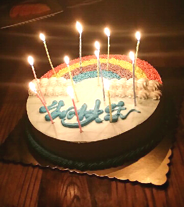 聚会开始,硕大的彩虹蛋糕上面插了12根蜡烛,代表我们每个月都充满了光明和希望。